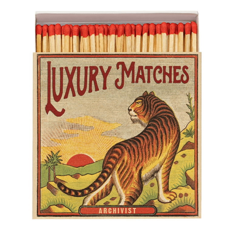 La boîte d’allumettes carrée emblématique représentant un tigre regardant le paysage avec un lever de soleil au loin, avec les mots « Allumettes de luxe ».