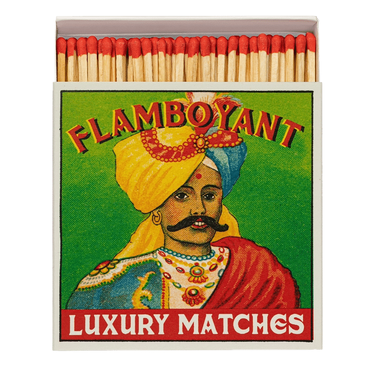 Notre boîte d’allumettes carrée emblématique, ornée d’une figure vibrante d’inspiration indienne et des mots « Flamboyant, Luxury Matches »
