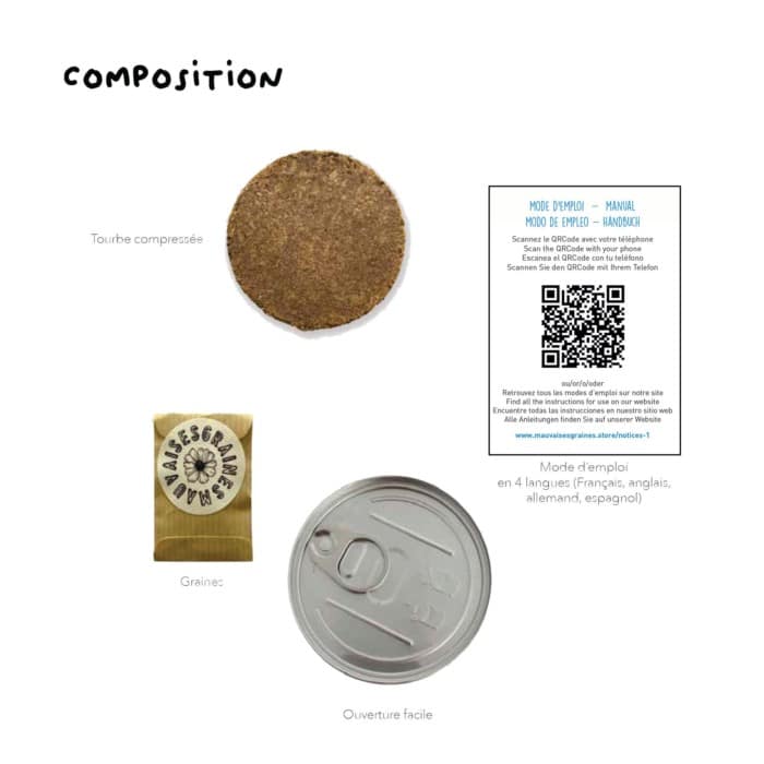 Tous les éléments nécessaires à la pousse de superbes fleurs : graines, terreau et mode d’emploi sont dans ce kit. Il vous permettra de faire pousser facilement un bouquet de fleurs colorées telles que des Centaurées ou des Cosmos. De plus, tous les éléments, de la boîte de conserve sont francais et éco-responsables. C’est un cadeau original pour remercier vos proches, ils pourront utiliser cette jolie boîte en décoration après avoir fait pousser leurs fleurs.