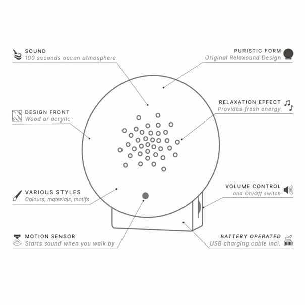 Les sons de la nature de l’Oceanbox vous transportent à la plage. Écoutez le bruit des vagues et le chant des mouettes et respirez profondément. L’ambiance sonore de l’Oceanbox vous invite à la détente et vous procure une sensation de liberté absolue. Deux sons marins de 100 secondes chacun offrent une variété d’ambiances.