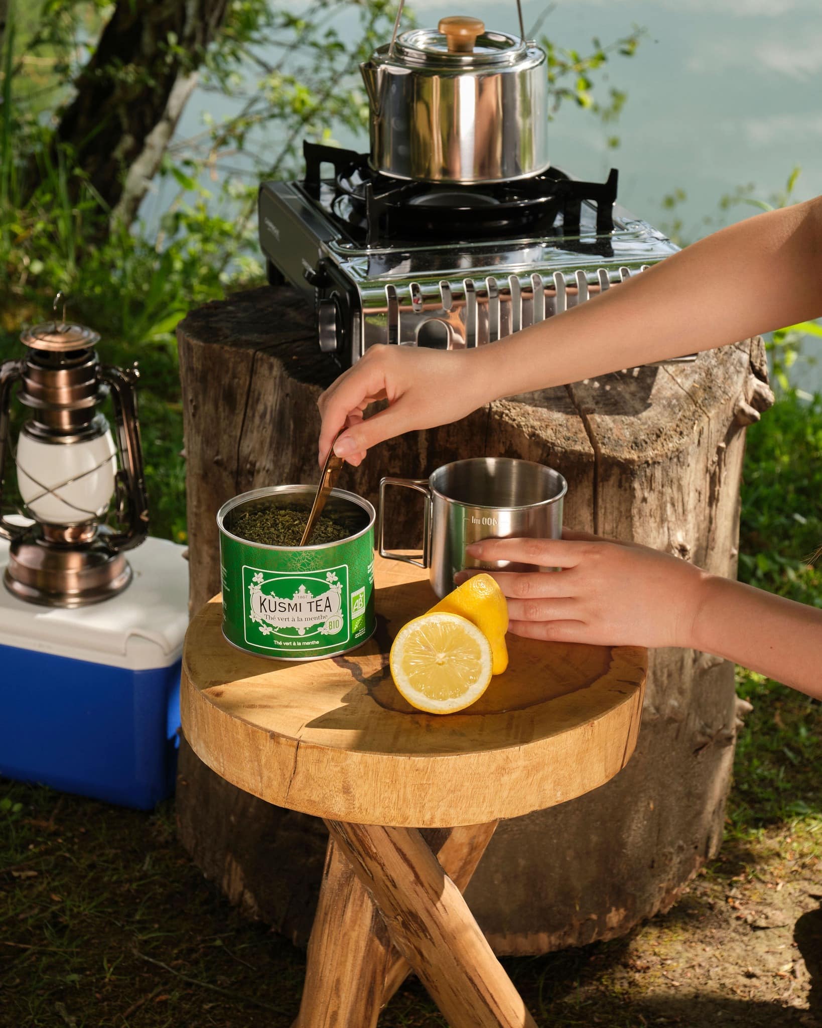 Thé vert à la menthe. Envie de voir du pays ? Le Thé vert à la menthe bio de Kusmi plante le décor et vous transporte au Maroc dès la première gorgée ! Comme le veut la tradition, vous versez l’eau frémissante de plus en plus haut… Les effluves du Thé à la menthe bio vous ont déjà emporté. Loin… et si près à la fois. Les feuilles des palmiers bruissent. Les fontaines chuchotent. Les dunes scintillent là-bas. Tout va bien, c’est juste l’effet menthe. Une menthe si rafraîchissante, accompagnée de ses petites billes de thé Gunpowder vif et puissant !