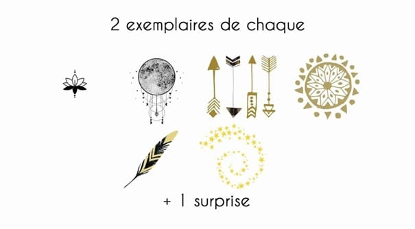 Contient des tattoos noirs et dorés sur un thème bohème chic.