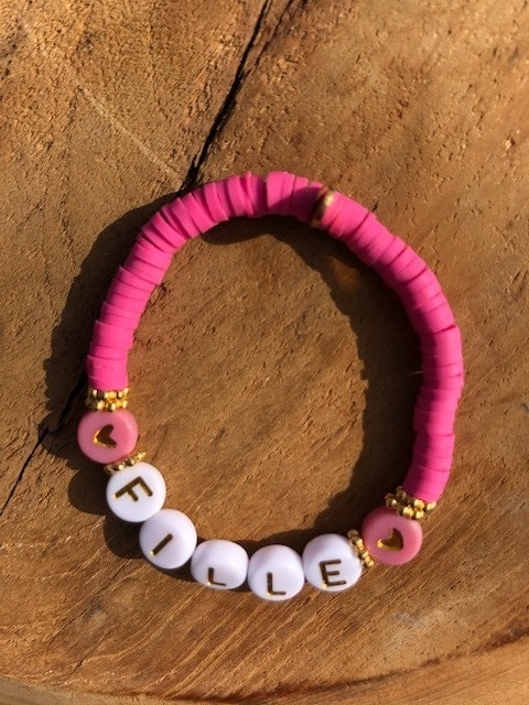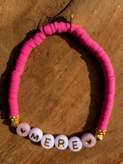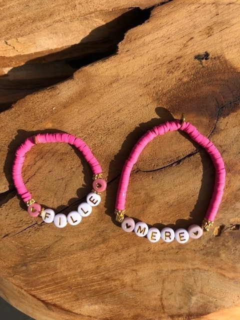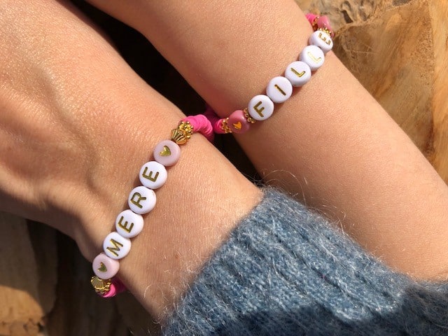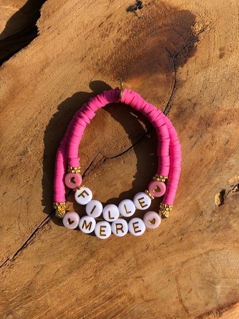 Un bracelet message « mère » et un bracelet enfant message « fille ». Pour des enfants de 5 à 8 ans. Les bracelets sont élastiqués.