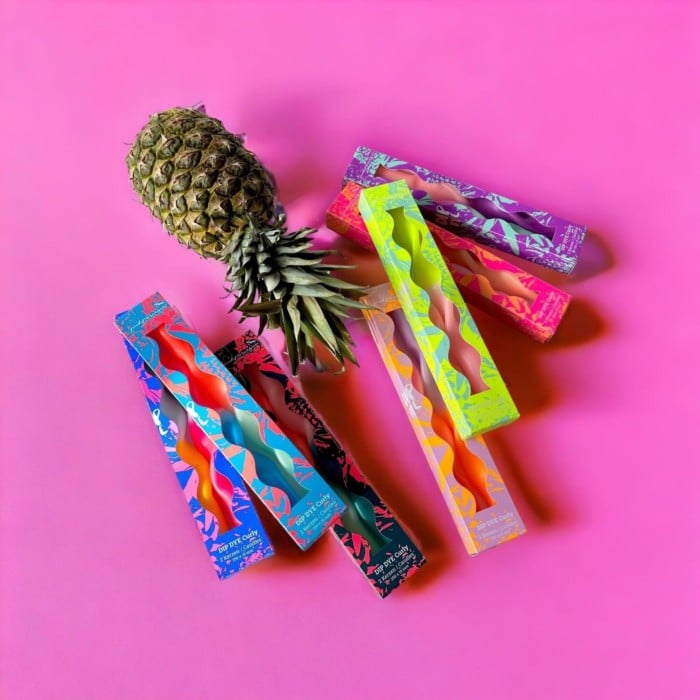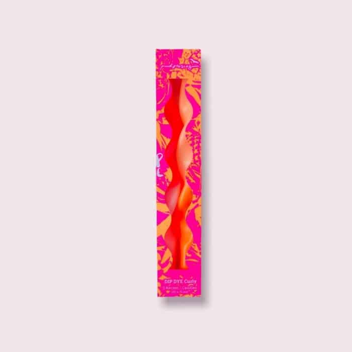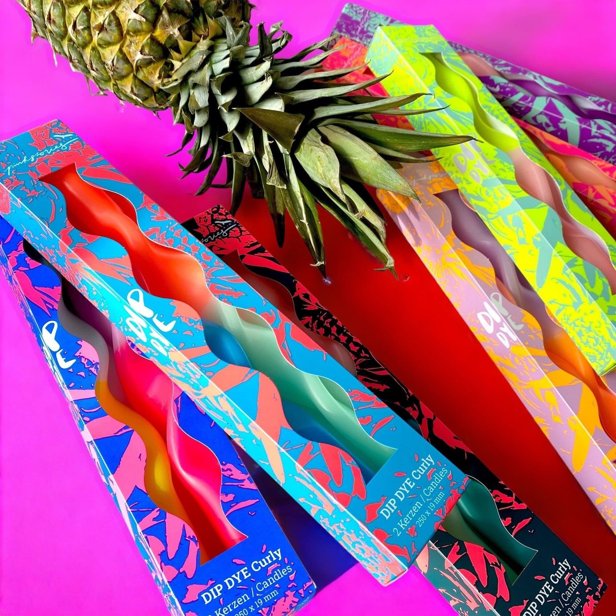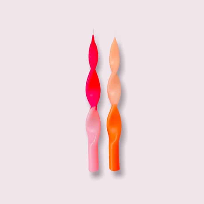 Ensemble de deux bougies en forme de néon teintées à la main et tournées à la main. Les couleurs restent les mêmes, les motifs varient avec chaque bougie et les rendent spéciales et uniques.