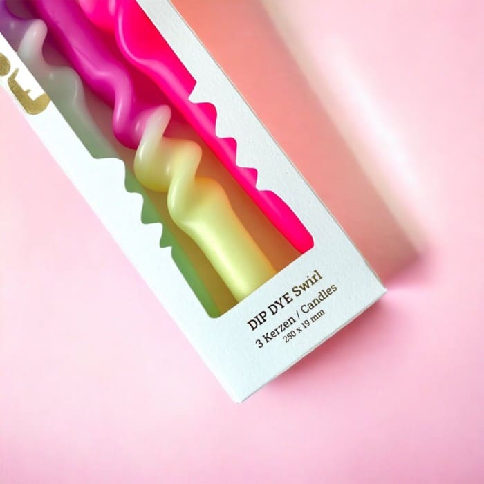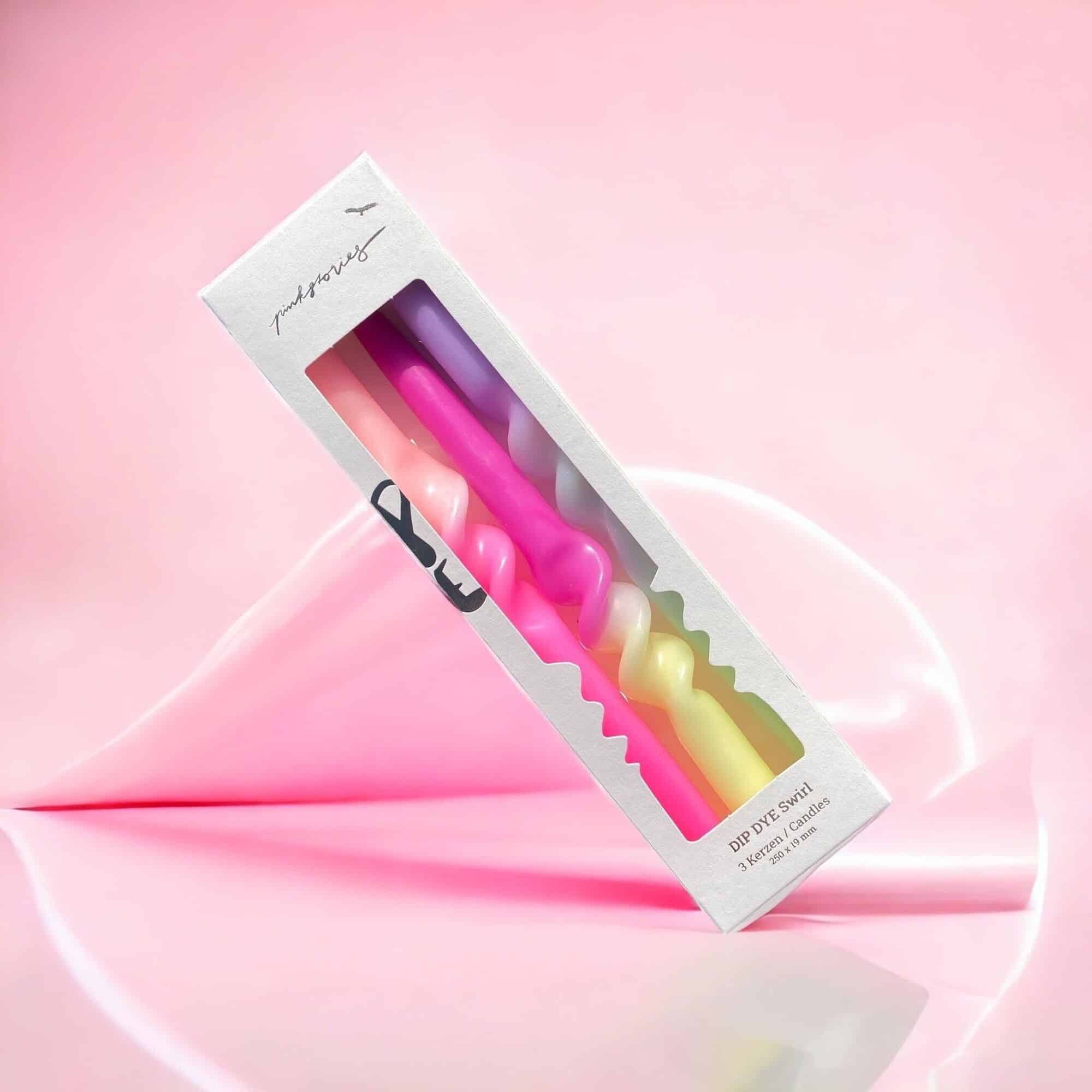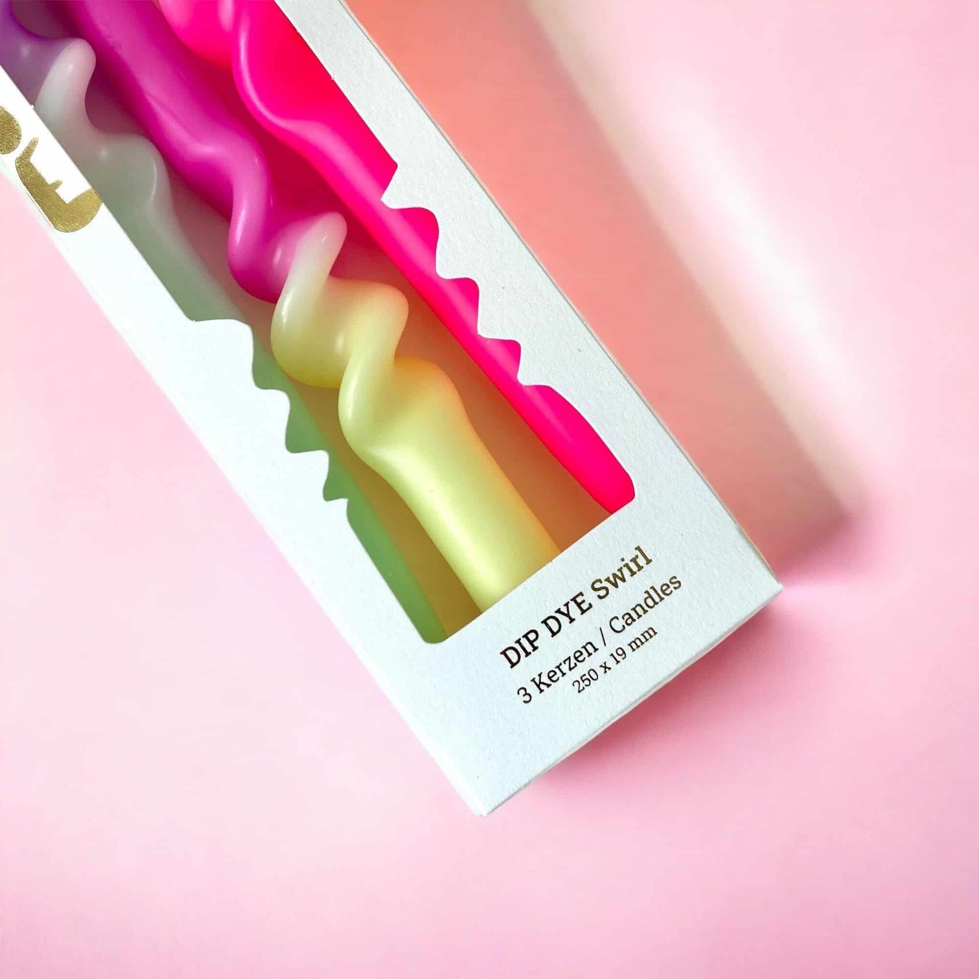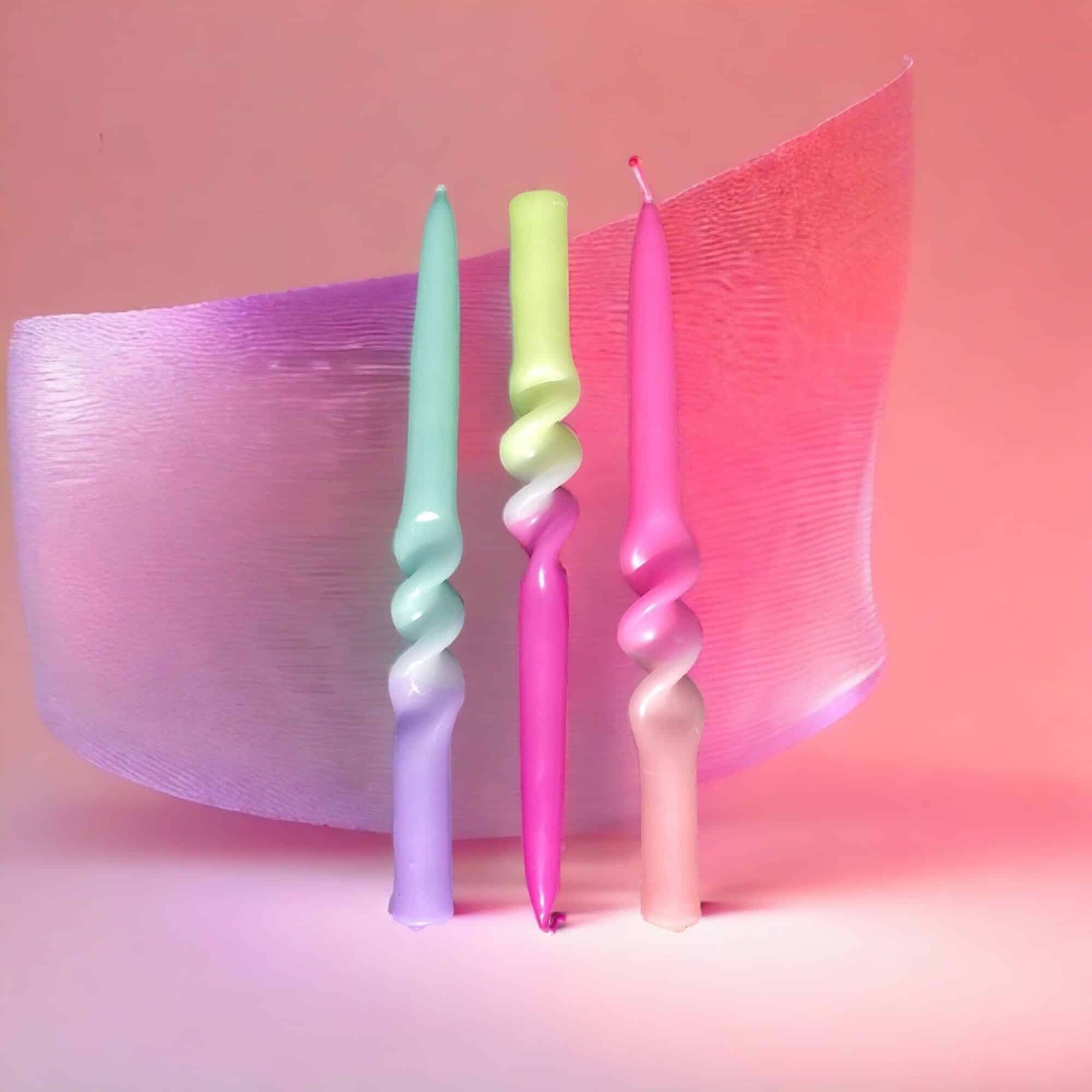 Ensemble de trois bougies torsadées effet néon colorées à la main. Les couleurs restent les mêmes, les motifs varient avec chaque bougie et les rendent spéciales et uniques.