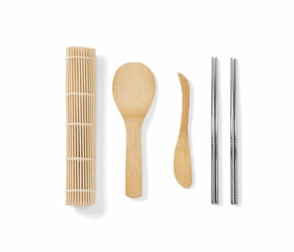 Inclus dans ce kit : 1 pagaie en bambou, 1 couteau à tartiner en bambou, 1 tapis à rouler en bambou, 8 baguettes.