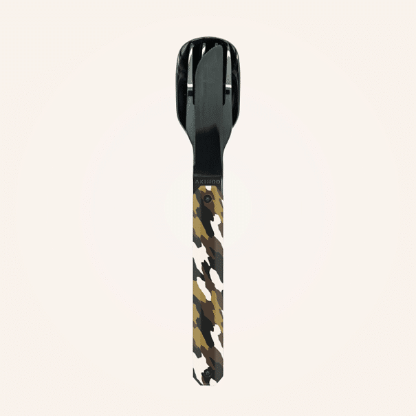 – Composé d’une grande cuillère, d’une fourchette 4 dents et d’un couteau à lame micro dentée.