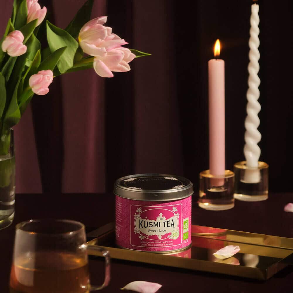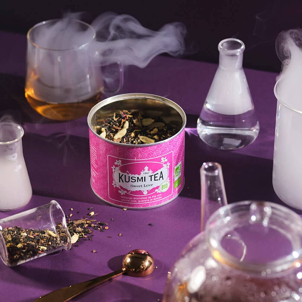 Mélange aromatisé de thé noir, poivre rose, guarana et épices« Une bonne dose de thé noir, un soupçon de poivre rose frais et anisé… et surtout, les épices enchanteresses indispensables à ce merveilleux élixir ! Clous de girofle, cardamome, cannelle, anis : parfait, elles sont toutes là. Place aux incantations et… STOP ! J’ai failli oublier les précieuses graines de guarana ! Cette fois, c’est prêt. Ce philtre d’amour est tout bonnement irrésistible. » Voilà à peu près ce qu’il se passe dans les ateliers de Kusmi pendant que nos experts concoctent votre Sweet Love. L’infusion biologique idyllique qui a tout d’une potion magique !