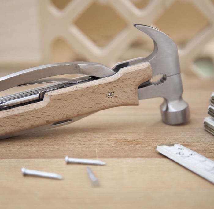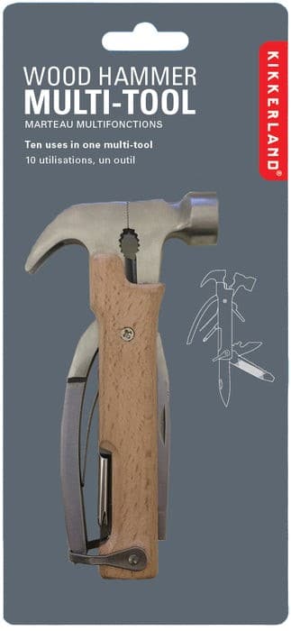 Le marteau à bois multi-outils comprend 10 outils en 1. Outils inclus : Marteau, tournevis à tête plate, décapsuleur, alésoir, lame de scie, lime, lame de couteau, tournevis à tête Phillips, pince et pince coupante.
