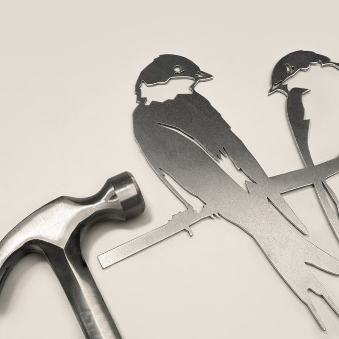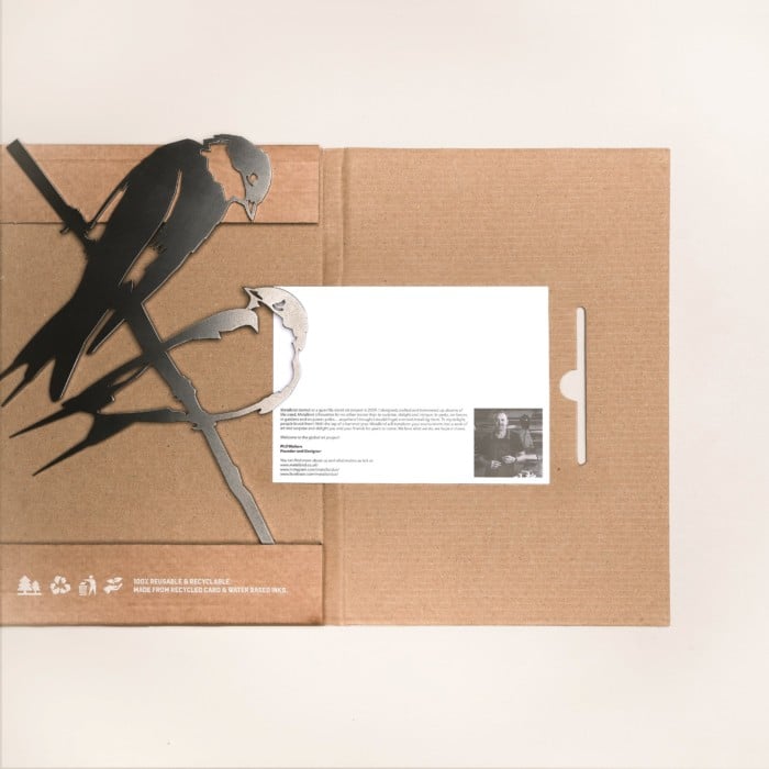 Avec l’aide d’un simple marteau, cette silhouette d’oiseau reconnaissable, fabriquée artisanalement, transformera votre extérieur en une œuvre d’art et fera sourire vos visiteurs pour les années à venir. Produire de façon locale et éthique est important pour nous. Chaque oiseau est découpé et fini avec soin dans une petite usine familiale à Amsterdam, dans de l’Acier Corten calibre 11.