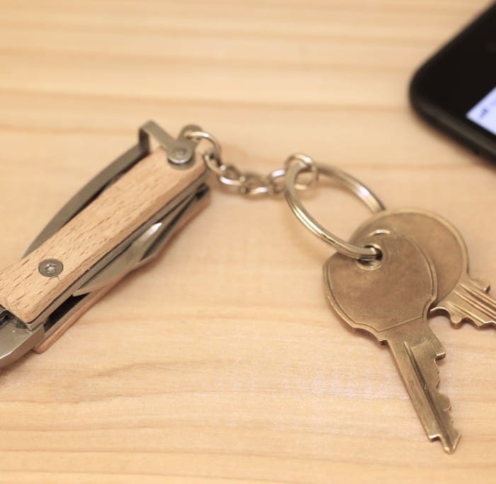 Décapsuleur, tournevis à tête plate, couteau et porte-clés en un seul objet.