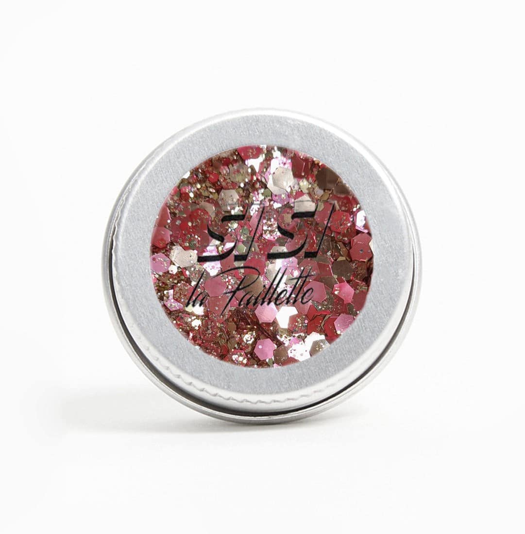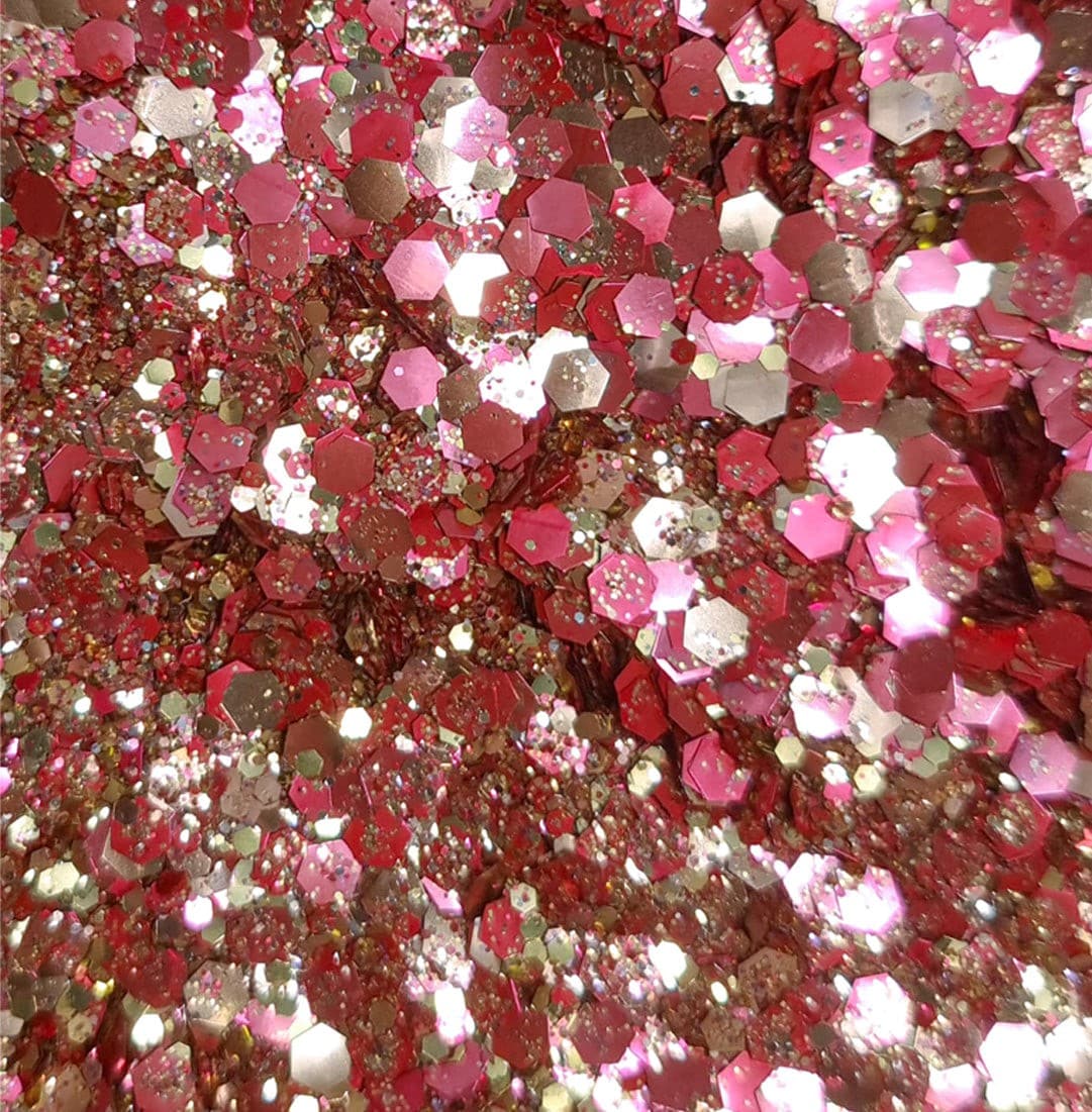 Un mélange de paillettes à base de plantes Vegas Bébé aux couleurs or rose et rouge, avec des pointes de doré, argenté et rose, et de toutes les tailles pour toujours plus de brillance !