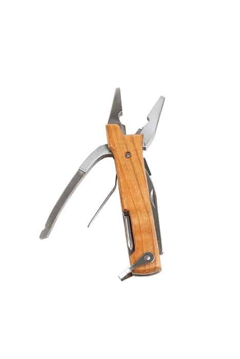 Ce multi-outil comprend : Pince, tournevis plat, décapsuleur, scie, lime, tournevis Philips et couteau.