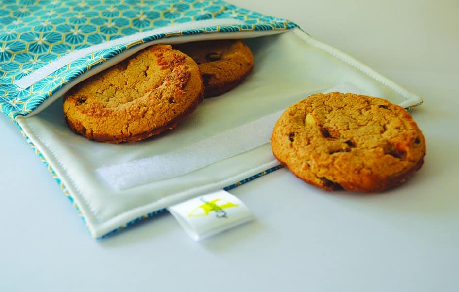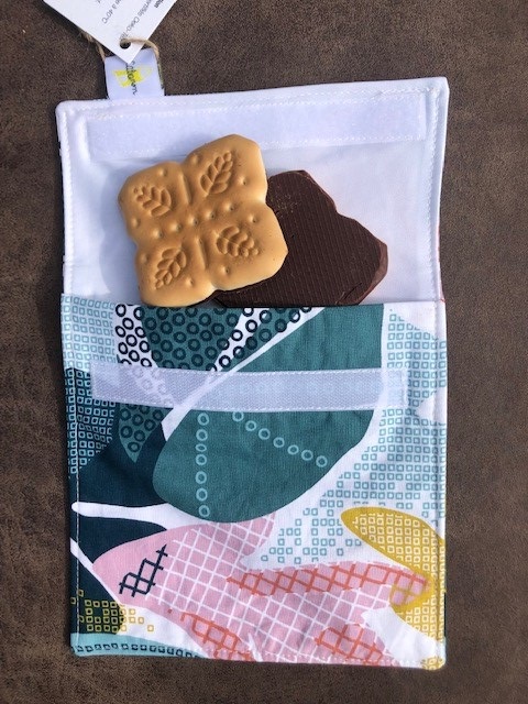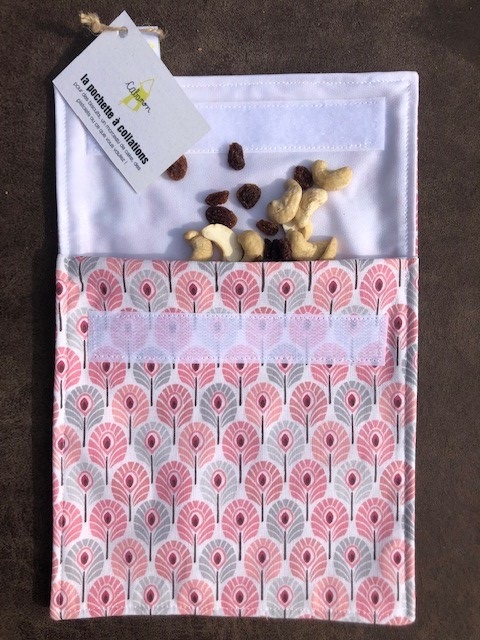 La pochette à collation est idéal pour transporter des biscuits, un morceau de cake, des pistolets ou ce que vous voulez! Prend peu de place dans le sac des petits et des grands. Fermeture avec scratch.