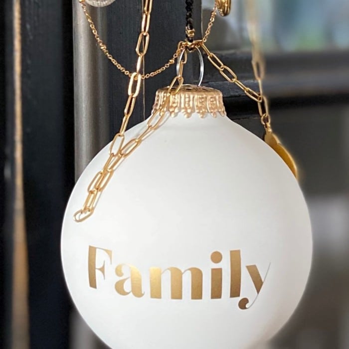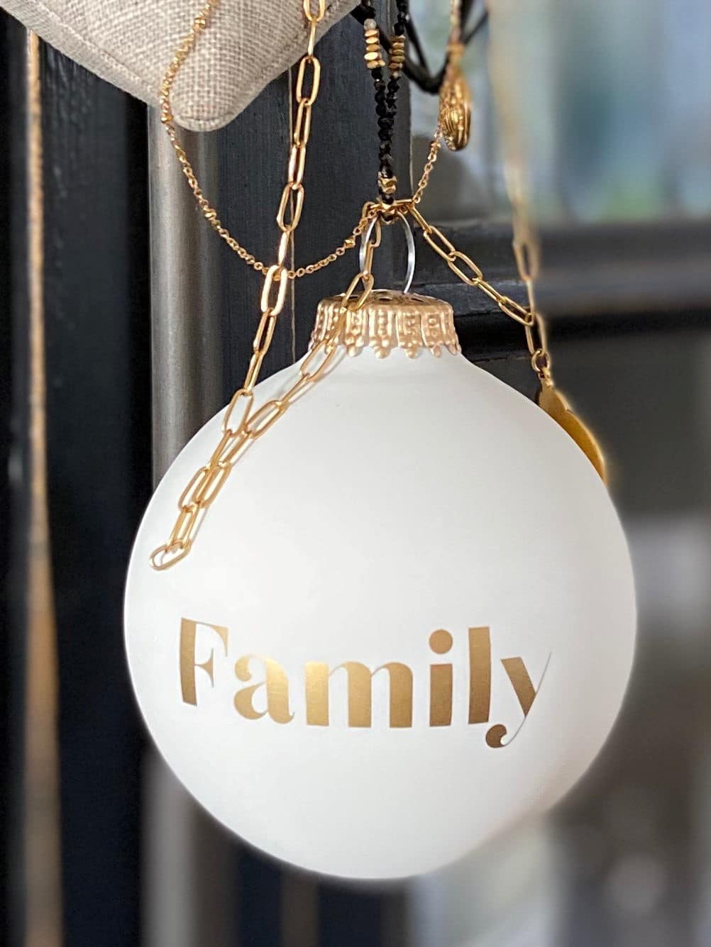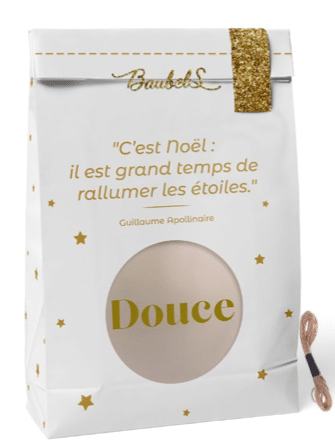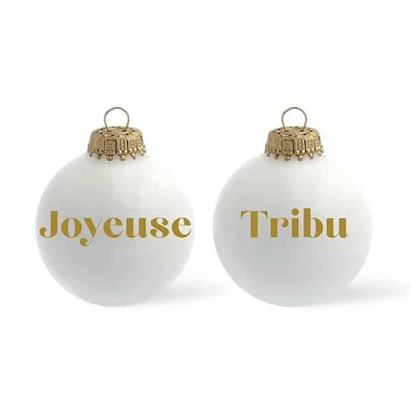 Une boule avec le texte « joyeuse » au recto et « tribu » au verso. Livrée dans son paperbag Baubels avec sa cordelette en chanvre.