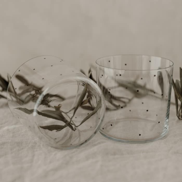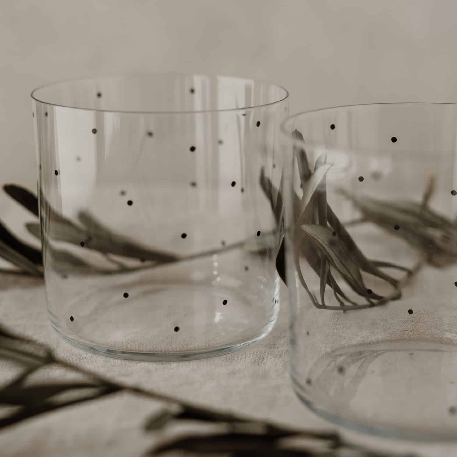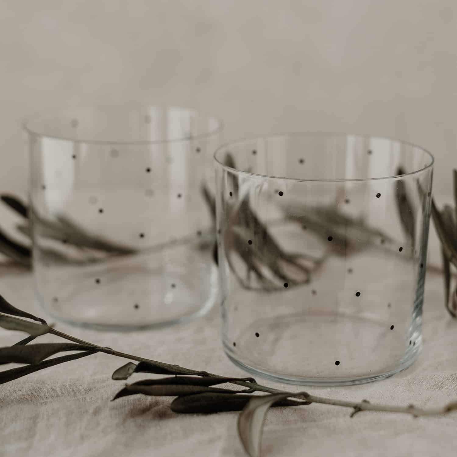 Verres à eau en lot de 2. Découvre deux magnifiques verres cylindriques avec une impression noire au laser sur la paroi et notre logo Eulenschnitt gravé sur le fond. Nos nouveaux verres ont une paroi très fine, sont donc super légers et pourtant extrêmement stables et empilables. C’est exactement ce qui les rend si spéciaux en combinaison avec le design minimaliste. Tout simplement un accroche-regard très spécial dans ta cuisine – que ce soit comme verre à eau, verre à cocktail, verre à dessert ou pour servir des fruits, des snacks ou des céréales ! Nos verres peuvent être utilisés de différentes manières !